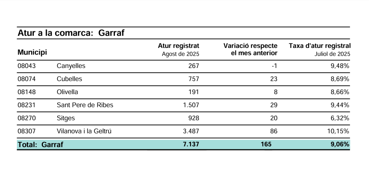 A tota la comarca també s’ha notat una remuntada de l’atur registrat durant l’últim mes. Al Garraf, en total, la xifra de persones aturades ha pujat en 165 persones i ha quedat en 7.137, quan fa un any se superaven les 7.340 persones. Per municipis, l’atur registrat ha pujat a tot arreu, excepte a Canyelles.