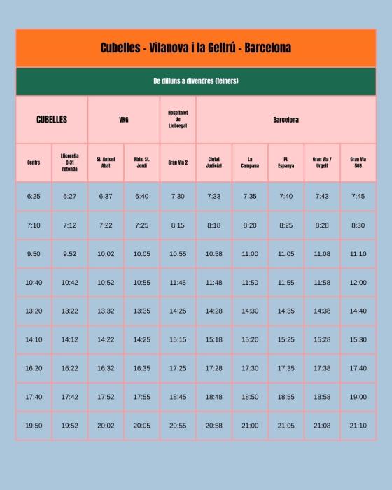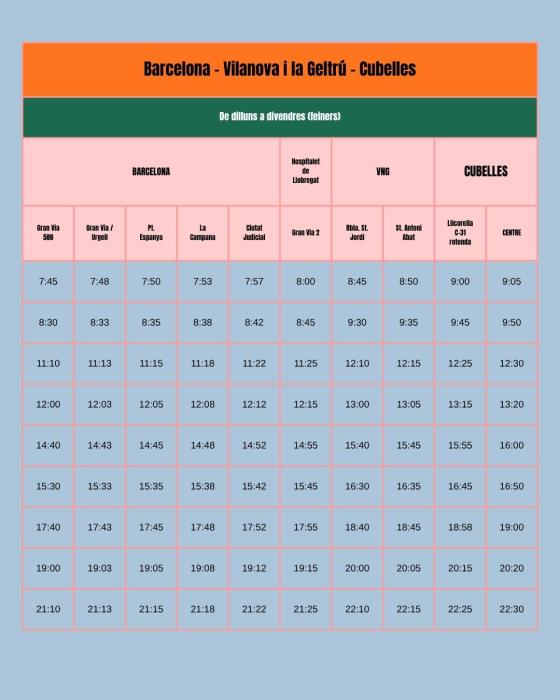 Després, tindrà dues parades a Vilanova i la Geltrú (Sant Antoni Abat i Rambla de Sant Jordi), una a l’Hospitalet (Gran Via 2) i cinc a Barcelona (Ciutat de la Justícia, La Campana, Plaça Espanya, Gran Via / Urgell i Gran Via 588). De tornada a Cubelles, el primer bus sortirà a les 7.45 h. des de Gran Via 588, i el darrer comboi tindrà la seva arribada al centre de Cubelles a les 22.30h.
