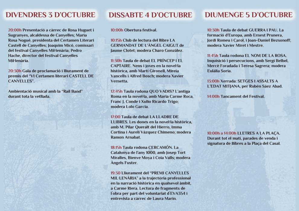 El programa inclou debats, clubs de lectura, taules rodones, xerrades i el lliurament del Premi Canyelles Mil·lenària, que reconeix la trajectòria professional en la narració històrica. En aquesta primera edició, el guardó serà atorgat a Carme Riera. Entre els participants hi destaquen noms rellevants del panorama literari català, com Jaume Clotet, Alfred Bosch, Martí Gironell, Xavier Vernetta, Sergi Belbel i Mercè Foradada.