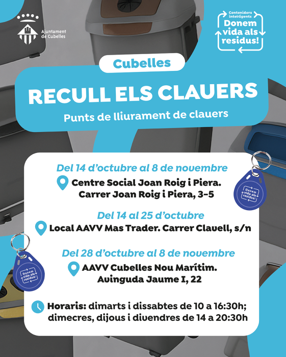 • Del 14 d’octubre al 8 de novembre, els clauers es podran recollir al Centre Social Joan Roig i Piera (carrer Joan Roig i Piera, 3-5).