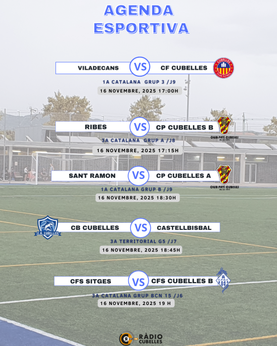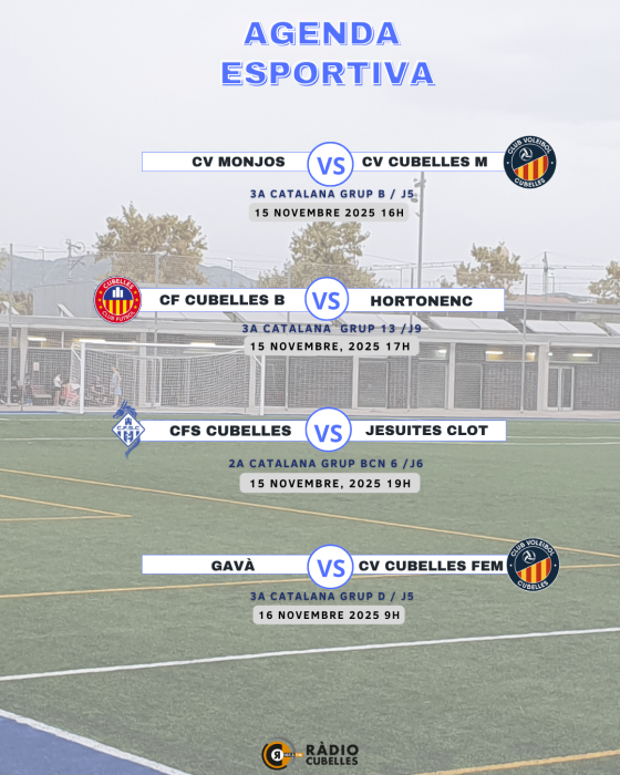 Els equips de Cubelles encaren un cap de setmana intens amb una àmplia agenda de partits repartits entre dissabte 15 i diumenge 16 de novembre. Les diverses disciplines esportives del municipi tornaran a competir en una nova jornada de les seves respectives lligues.
